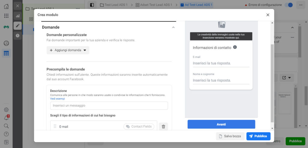 La compilazione della sezione successiva è una di quelle che richiede maggiore attenzione durante la creazione di una campagna di Generazione di contatti.